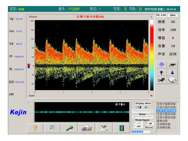 KJ-2V6M+超聲經顱多普勒血流分析儀是南京科進實業有限公司新推出的一款高性價比三探頭TCD產品,產品匯集了多深度M模、趨勢圖、栓子跟蹤、小信號識別和自動搜索血管等多項TCD新技術,可實現單、雙通道模式檢測,多深度模式可現實一條血管的八個深度的血流頻譜信息,有效協助醫生快速做出診斷。